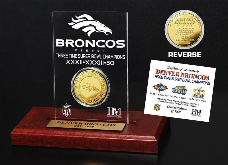 ***Denver Broncos 3-Time Super Bowl Champions Gold Coin Etched Desktop Display LE