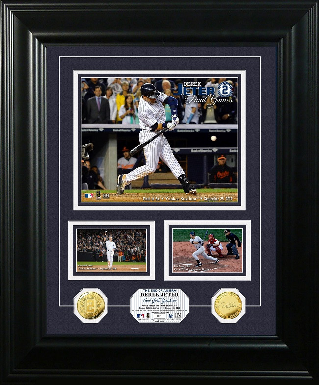 Limited Edition of only 500! This is not only a great collectible but youre contributing to Dereks Turn 2 Foundation! This 18x 22 frame with 3 wide molding and triple matting features an 8x10 photo of Derek Jeter final at bat at Yankee Stadium on September 25, 2014. Matted below the main photo are two 3x5 photos, one featuring his farewell at his final game at Yankee Stadium and the other photo features his final career hit at his final career game! Included in the matting is a minted 39mm Derek Jeter final season commemorative coin and a Derek Jeter Final Season commemorative coin, both are flash plated with gold. A numbered certificate of authenticity is matted between the gold coins. This unique collectible is is officially licensed by MLB and MLBPA. Proudly made in the U.S.A by The Highland Mint!