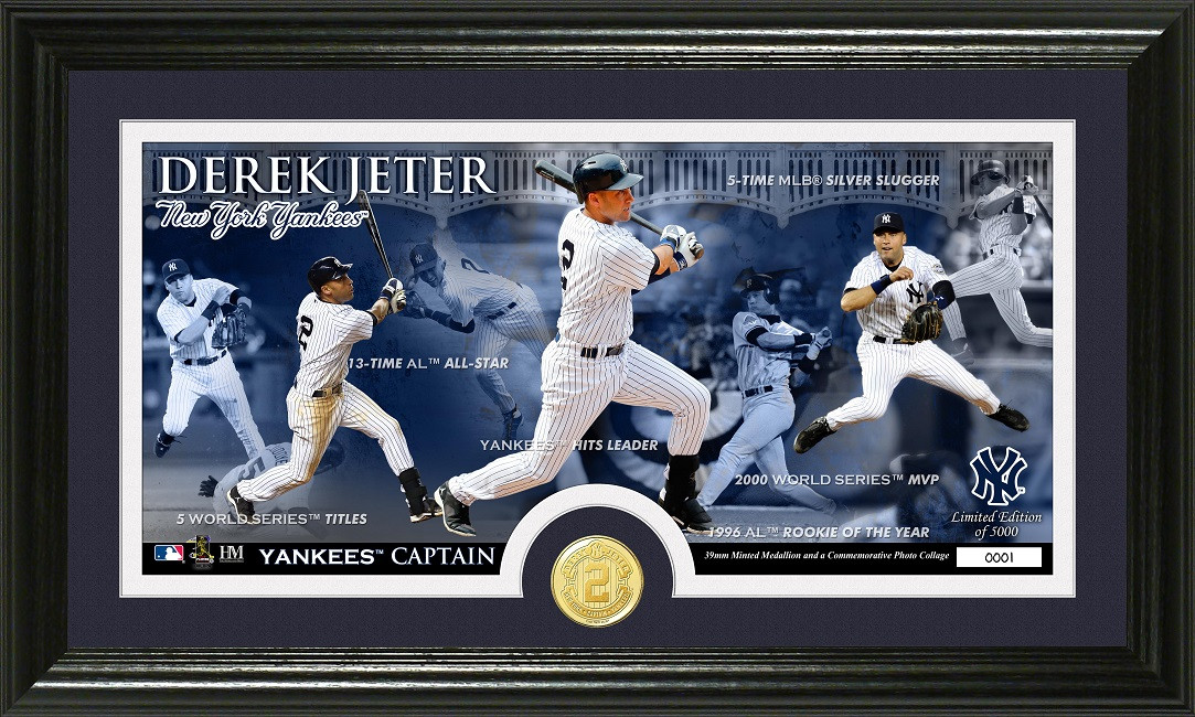 Limited Edition of 5000! This is not only a great collectible but youre contributing to Dereks Turn 2 Foundation! This unique 12x 20 Collectible frame features under glass a custom panoramic collage Photo of Derek in action and his greatest career accomplishments! Each Jeter Legend photo is individually hand numbered and double matted! Also matted is a 39mm minted Derek Jeter Final Season commemorative steel coin. Each frame has a Certificate of Authenticity pasted to the back. Officially Licensed by MLB, MLBPA and the Turn 2 Foundation. Proudly made in the USA by The Highland Mint.