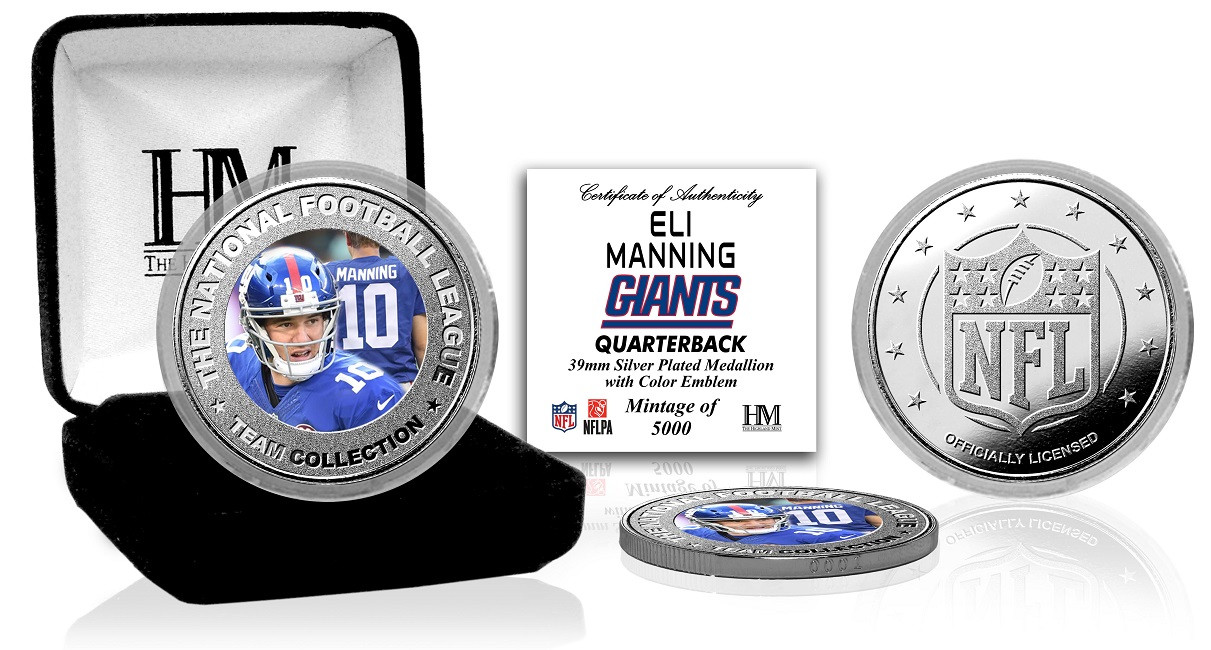 Limited edition! Eli Manning's color image is embedded in the center of this 39mm minted commemorative coin. Each silver plated coin is protected in a clear capsule to preserve its condition and delivered in a black velour jewelry display box. A limited edition of only 5000, each mint coin is individually struck with a serial number on its edge and accompanied by a certificate of authenticity. It is officially licensed by the NFL and NFLPA and proudly made in the USA by The Highland Mint.