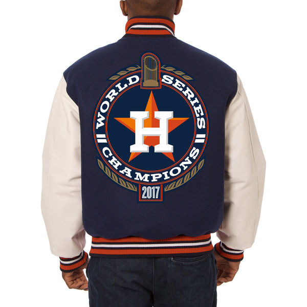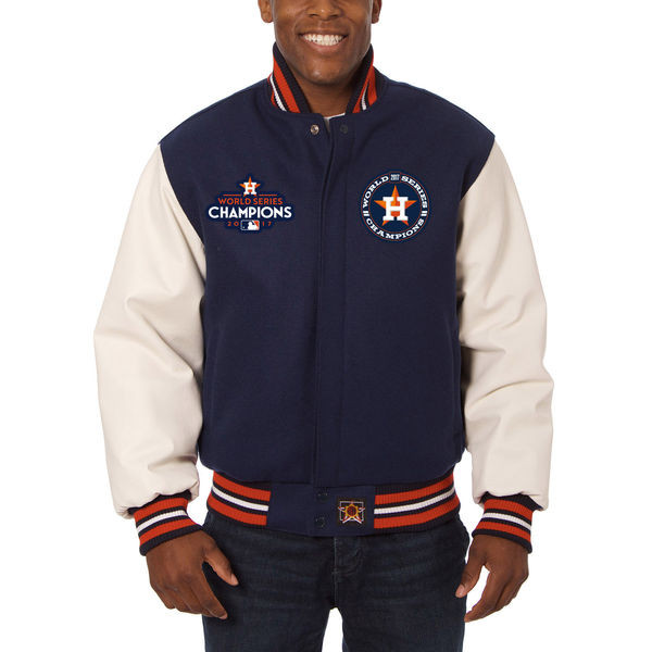 Houston Astros 2017 World Series Champions Wool Jacket with Leather Sleeves - Navy/White