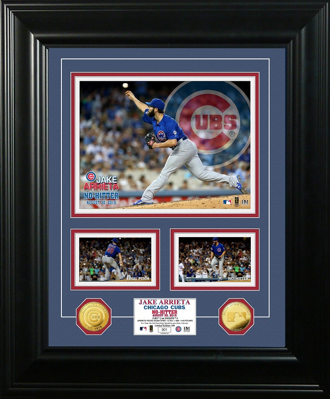 Limited Edition of only 500!Measuring 18x 22, this frame has 2.75 wide molding with triple matting and a plexi glass front panel. Featured in this deluxe frame is an individually numbered 8x 10 custom photo of Arrieta pitching his No-Hitter with a 3x 5 action photo of his final pitch to seal the No-Hitter and a 3x 5 photo of Arrieta celebrating his first No-Hitter. Also included are two minted 39mm gold flash plated commemorative coins making this a truly unique piece. The team coin and the MLB logo coin are struck to highest standards in minting tradition and flash plated with gold. An individually numbered certificate of authenticity along with his stats from the night is matted between the coins. Officially licensed with the MLB and MLBPA and proudly made in the USA by The Highland Mint!