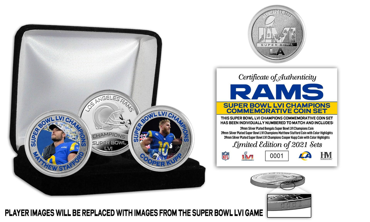 Los Angeles Rams Super Bowl LVI Champions 3pc Silver Color Coin Set w/Case LE 2,021