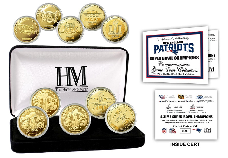 New England Patriots 5 Time 5pc Super Bowl Championship 24k Gold Coin w/Case LE 5,000