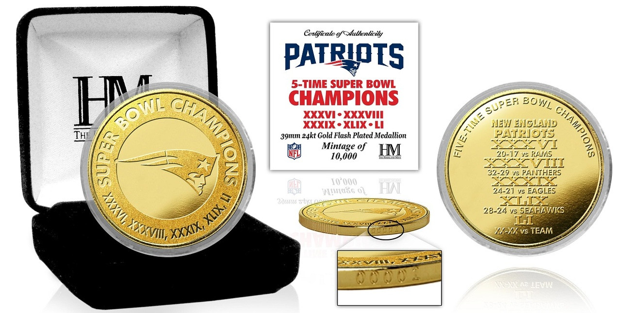 New England Patriots 5 Time Super Bowl Championship 24k Gold Coin w/Case LE 5,000