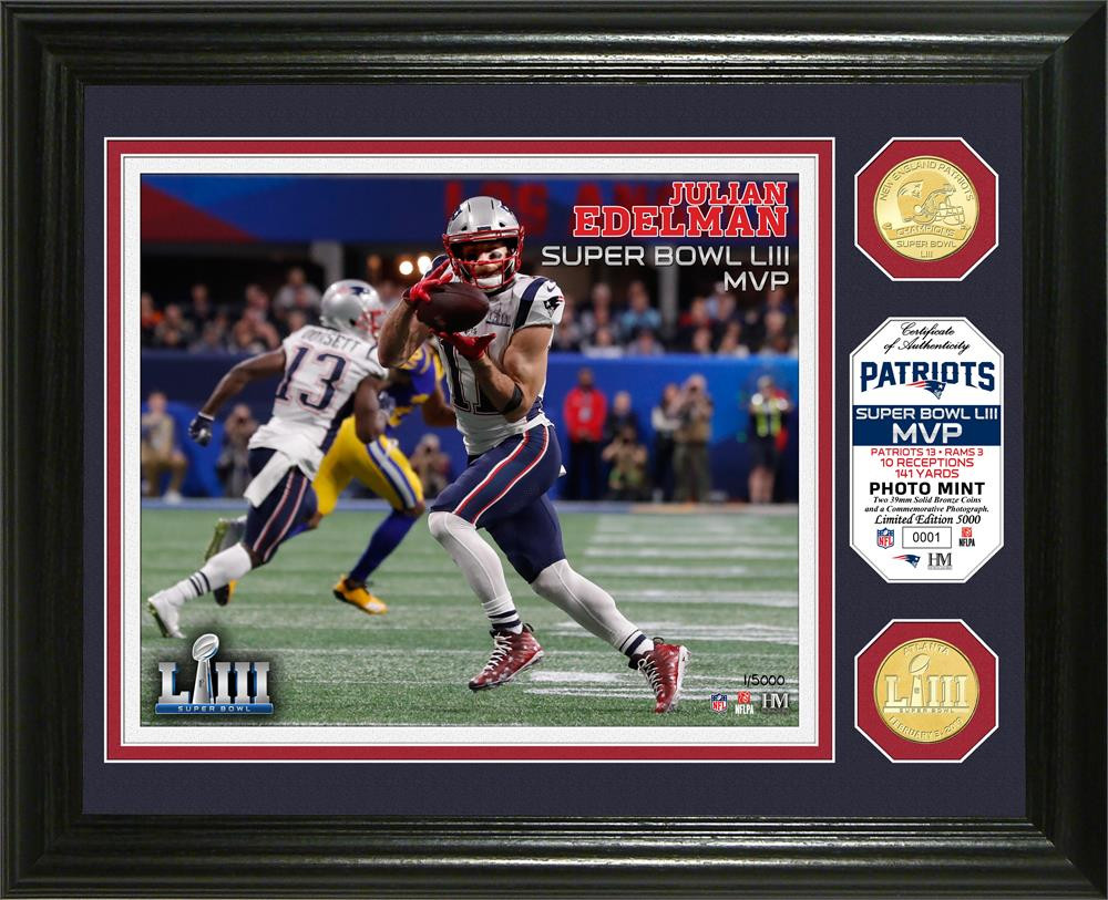 New England Patriots Julian Edelman Super Bowl 53 MVP 2pc 24k Gold Coin Photo Mint Framed LE 5,000