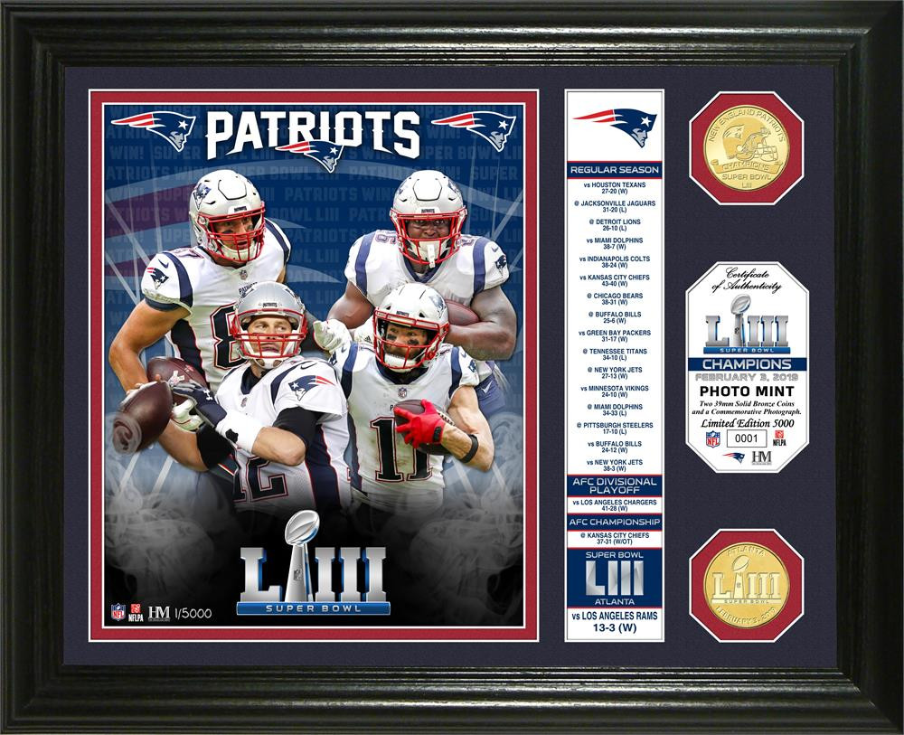 New England Patriots Super Bowl 53 Champions Banner 2pc 24k Gold Coin Photo Mint Framed LE 5,000