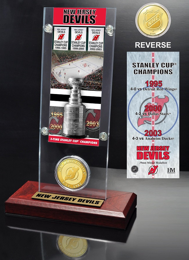 New Jersey Devils 3x Stanley Cup Champions Ticket and Bronze Coin Acrylic Display