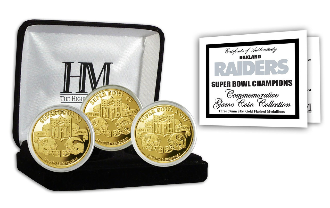 Oakland Raiders 3 Time Super Bowl Champions 3pc Gold Coin Set w/Case LE