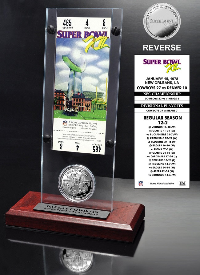 A replica of the SuperxII Ticket is featured in this unique acrylic case with a 39mm minted Game Coin! Each Super Bowl Ticket is an official replica on the front with the teams Regular and post season scores listed on the back! Its displayed on a wood base with a replica of the Game Coin minted with the dueling team logos on the front and the SB logo on the back as well as individually numbered. Each Coin is protected in an air tight capsule and displayed in a die cut hole in the acrylic allowing easy removal. Each wood base has a custom enfraved nameplate and each is accompanied by a Certificate of Authenticity.Officially Licensed by the NFL and proudly made in the USA by The Highland Mint.
