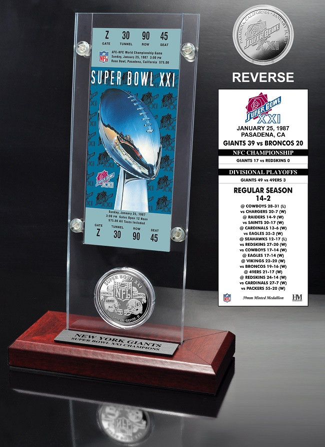 A replica of the SuperxXI Ticket is featured in this unique acrylic case with a 39mm minted Game Coin! Each Super Bowl Ticket is an official replica on the front with the teams Regular and post season scores listed on the back! Its displayed on a wood base with a replica of the Game Coin minted with the dueling team logos on the front and the SB logo on the back as well as individually numbered. Each Coin is protected in an air tight capsule and displayed in a die cut hole in the acrylic allowing easy removal. Each wood base has a custom enfraved nameplate and each is accompanied by a Certificate of Authenticity.Officially Licensed by the NFL and proudly made in the USA by The Highland Mint.