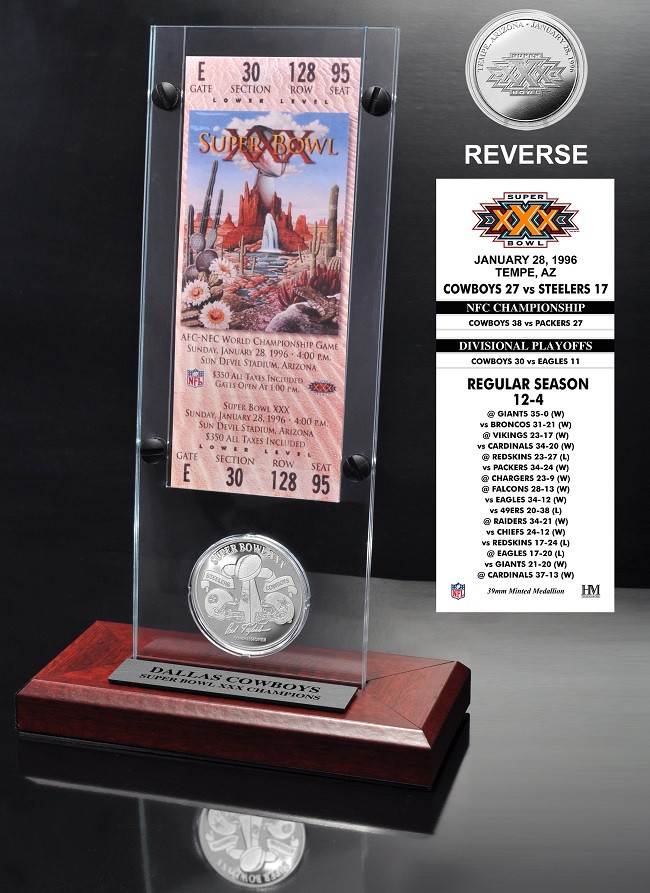 A replica of the SuperxXX Ticket is featured in this unique acrylic case with a 39mm minted Game Coin! Each Super Bowl Ticket is an official replica on the front with the teams Regular and post season scores listed on the back! Its displayed on a wood base with a replica of the Game Coin minted with the dueling team logos on the front and the SB logo on the back as well as individually numbered. Each Coin is protected in an air tight capsule and displayed in a die cut hole in the acrylic allowing easy removal. Each wood base has a custom enfraved nameplate and each is accompanied by a Certificate of Authenticity.Officially Licensed by the NFL and proudly made in the USA by The Highland Mint.