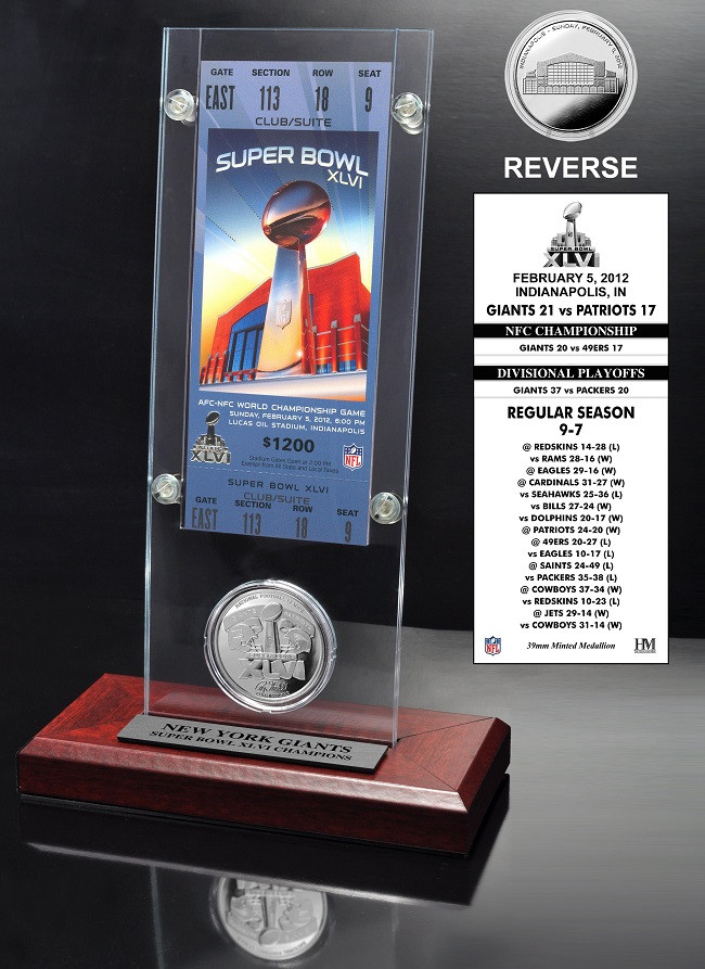A replica of the SuperxLVI Ticket is featured in this unique acrylic case with a 39mm minted Game Coin! Each Super Bowl Ticket is an official replica on the front with the teams Regular and post season scores listed on the back! Its displayed on a wood base with a replica of the Game Coin minted with the dueling team logos on the front and the SB logo on the back as well as individually numbered. Each Coin is protected in an air tight capsule and displayed in a die cut hole in the acrylic allowing easy removal. Each wood base has a custom enfraved nameplate and each is accompanied by a Certificate of Authenticity. Officially Licensed by the NFL and proudly made in the USA by The Highland Mint.