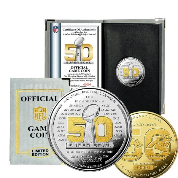 The Game doesnt start without the Flip Coin. For the 24rd consecutive year The Highland Mint is proud to mint the Official Super Bowl Flip Coin. Each coin is carefully struck of fine silver plate and selectively plated with 24kt gold! Featured on the obverse is the official SB 50 logo that features the Vince Lombardi Trophy as well as the commissioners signature. The reverse is minted with a unique Super Bowl 50 logo that incorporates the team logos in the number 50. Also minted on the perimeter is the date and location of the game. Each Flip coin measures 1.5 inch diameter, approximately the size of a silver dollar. Each is individually numbered on the coin to match the number on the certificate of authenticity that accompanies each flip coin. The 2-tone coin is protected in an acrylic capsule to preserve its condition and it is delivered in a custom 6" x 4" booklet only used for the Super Bowl Flip Coin each year. The booklet allows one to flip the center coin holder to view both sides. An individually numbered certificate of authenticity to match the number on the coin is included in the custom case. A limited mintage of only 10,000 and officially licensed by the National Football League. Proudly made in the U.S.A.