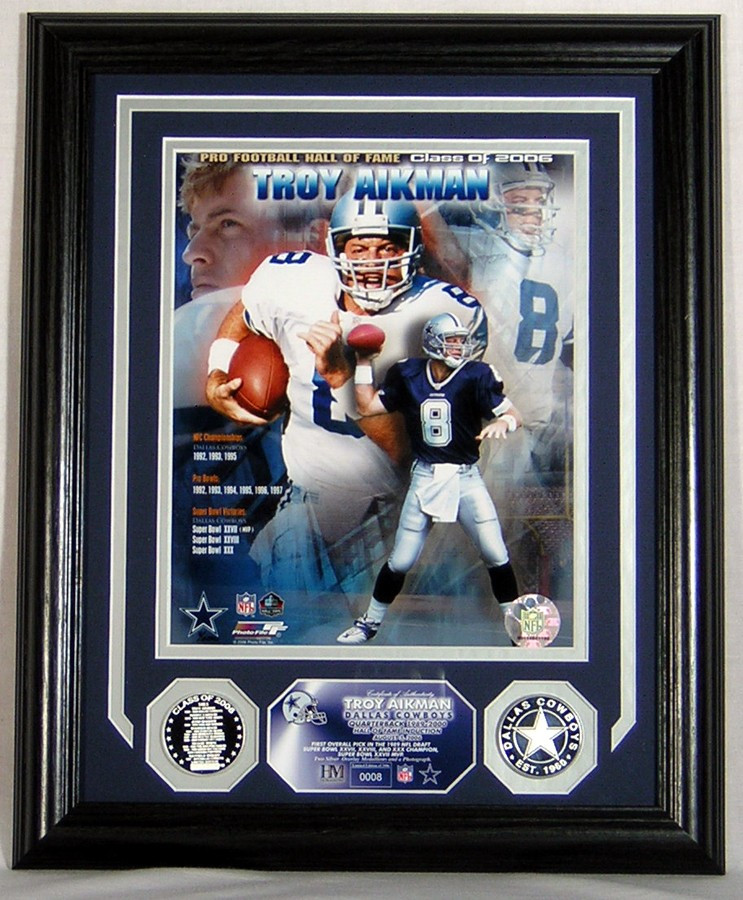 The Highland Mint presents the Troy Aikman Hall Of Fame Induction Photomint. Troy Aikman enters the Hall as a first ballot Hall of Famer after a distinguished career that saw him being picked # 1 overall by the Cowboys and leading them to 3 Super Bowl Championships. An individually numbered Hall of Fame Induction collage photo of Troy is presented in a 13x 16 frame with navy on silver double matting and with a silver overlay Class of 2006 minted coin and a silver overlay Dallas Cowboys coin. A numbered certificate of authenticity is matted between the two silver coins and list the date of his enshrinement and his career accomplishments. This officially licensed by the NFL and is limited to 2006 pieces.