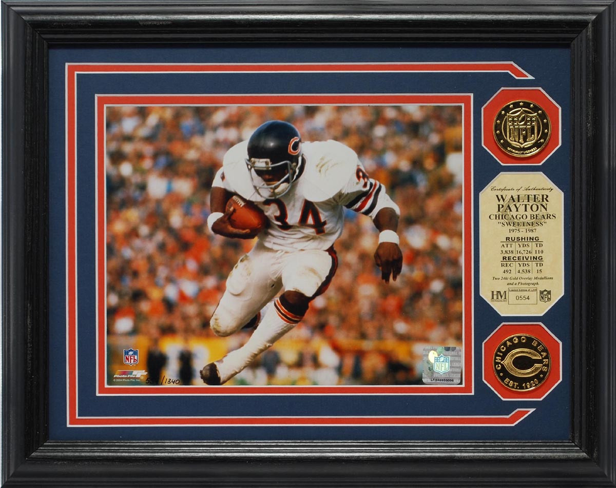 The Highland Mint presents the Walter Payton Photomint. This unique framed collectible, features Walter in action, measures 13x 16 and its ready to hang. The 8x10 action image is individually numbered and features team colored double matting. It is framed with 2 24KT Gold coins, a Chicago Bears franchise coin and a NFL logo coin (both the size of a silver dollar). A numbered certificate of authenticity is mounted on the front between both gold coins. This is officially licensed by the NFL and is limited to 1340 pieces.