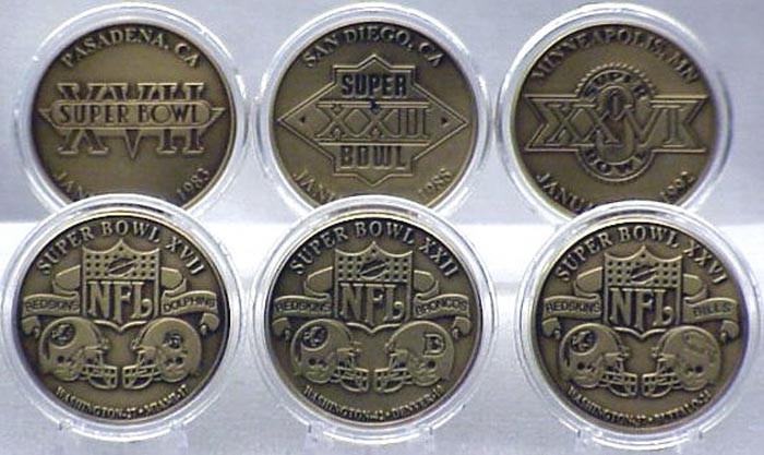 As the company commissioned by the NFL to make the Super Bowl flip coin for the past 10 years the Highland Mint has been granted the approval to go back in time and commemorate past Super Bowls.This unique match numbered souvenir coin collection commemorates the Washington Redskins Championship teams of Super BowlxVII,xXII andxVI. Each coin has a similar design of the current flip coins that includes dueling helmets, ribbons with team names and Super Bowl Commemoration on the front and the reverse of the coin features the Super Bowl Logo for that year as well as the date that the game was played.ú Super BowlxVI: This coin features the NFL Shield as a replacement of the Lombardi Trophy and includes the score of the game on the front of the coin. Washington 27 Miami 17ú Super BowlxXII: This Coin features the NFL Shield as a replacement of the Lombardi Trophy and includes the score of the game on the front of the coin. Washington 42 Denver 10 ú Super BowlxXVI: This Coin features the NFL Shield as a replacement of the Lombardi Trophy and includes the score of the game on the front of the coin. Washington 37 Buffalo 24 Each of the coins in the set is individually numbered to match. They are individually placed in clear protective capsules and presented in a Custom black velour jewelry box. A numbered certificate of Authenticity to match the numbered coins accompanies each set.